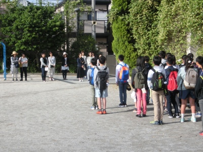お見送りに来てくださった保護者の方々に「行ってきます」の挨拶をしました。