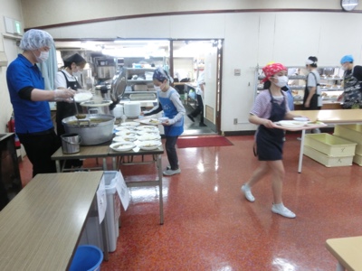 夕食20分前から、食堂で食事係が配膳をします。トレイの上に、おかずのお皿を載せて運んでいきます。