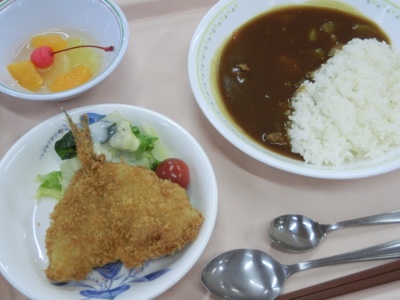 今夜のメニューは、カレーライス、アジフライ、フルーツポンチなどでした。