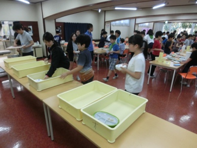 食器の片付けはグループごとにまとめて運びます。