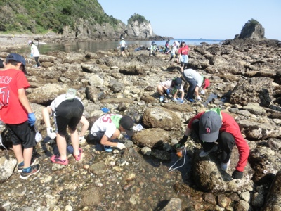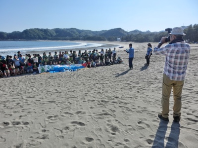 磯観察の後、弓ヶ浜に出て、全員で記念写真を撮影しました。とてもいい天気で、自然に触れることができた一日でした。