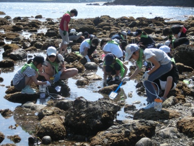 子どもたちは持ってきた網などを使って、カニや魚を捕まえていました。時間を忘れて夢中になっています。