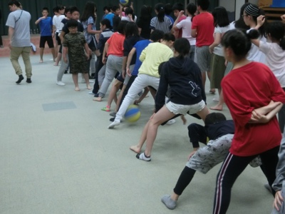 最初は「ボール送りゲーム」です。頭の上を送っていきます。一番後ろまで行ったら、ボールを持って列の前まで走ります。
