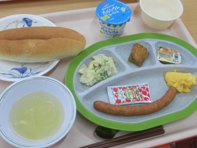 今朝のメニューは、パン、野菜スープ、ソーセージ、ヨーグルトなどです。