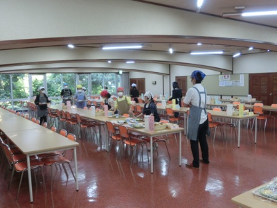 食堂の全景をご紹介していなかったので、この画像を。手前に立っているのは、エプロン姿の城鼻先生。食事係担当です。