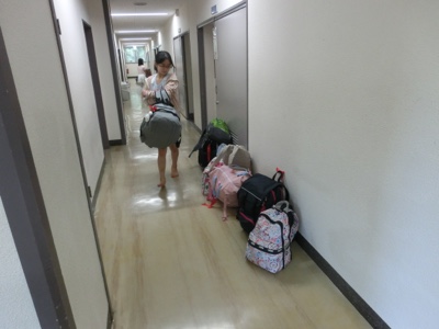 最終日の朝は、朝食の前後の時間に部屋を片付けなければなりません。部屋によって進み具合に差があります。この部屋はずいぶん片付いていますが…