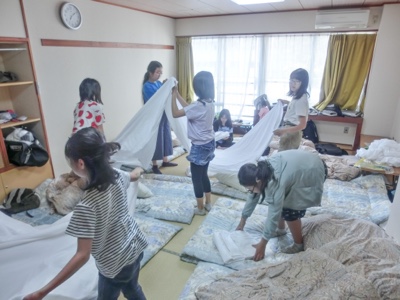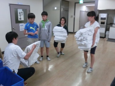 シーツや布団カバーを畳んだら、返却に行きます。城鼻先生の厳しい枚数チェックが入ります。
