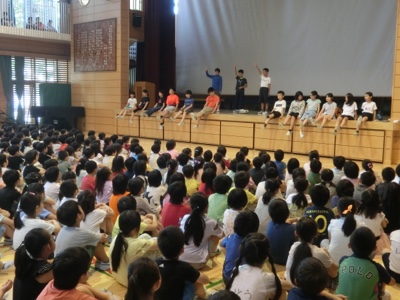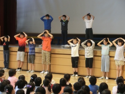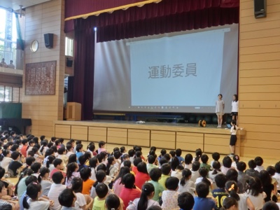 毎週月曜日の朝は全校朝会がありますが、月末の月曜日だけは体育や保健に関する内容の「健康朝会」になります。今朝は、運動委員会から、来月始まるプールについての話がありました。