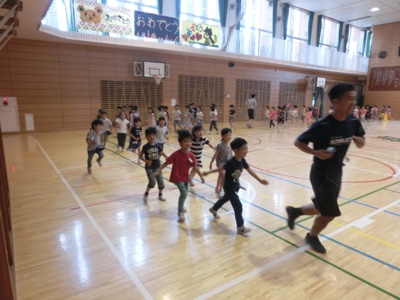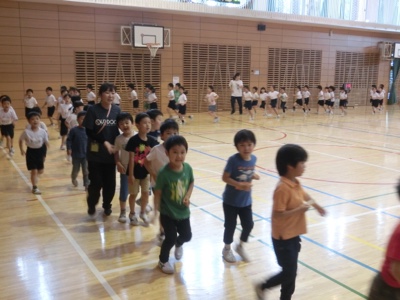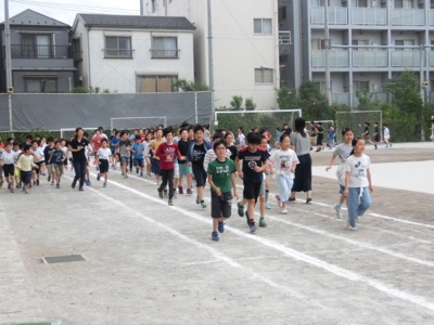 今日は「集団走」と言って、クラスみんなで固まって走る日でした。3年生は4分、6年生は7分走り続けます。