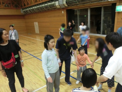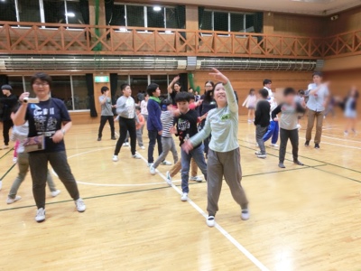 夜は体育館でのレクリエーションです。はじめに「できるかな」を踊りました。
