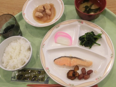 今朝のメニューは、焼き鮭、味噌汁、ごはんです。