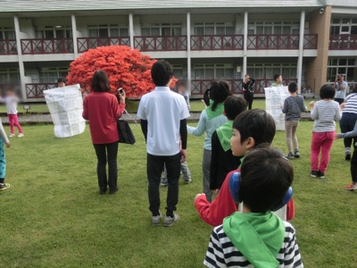 園庭で朝会をします。富士学園の歌の歌詞を持つ係の仕事をしました。