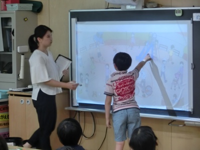 前に出て、自分が印を付けたところを電子黒板で示していました。