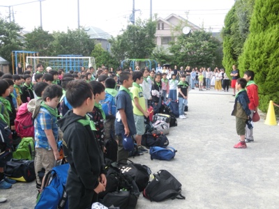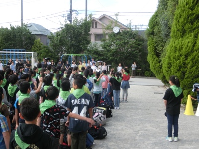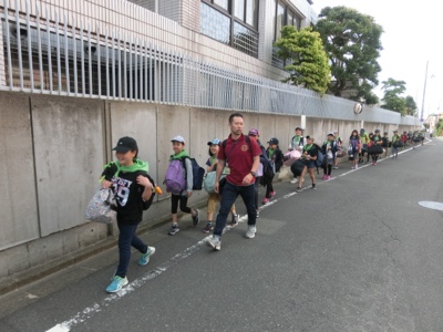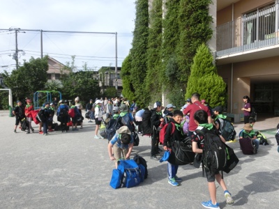 今日から2泊3日、5年生が富士学園移動教室に出かけます。朝7:00、集合時刻に大きな荷物を持った子どもたちが集まってきました。