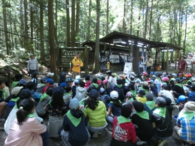 バスは富岳風穴に到着しました。今のところ、バス酔いの子は一人もいません。