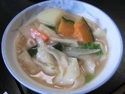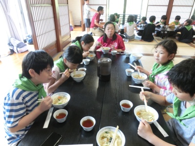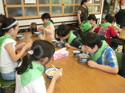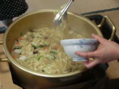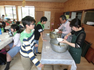 少し待っていると、大鍋で作られたほうとうが運ばれてきました。子どもたちは大喜びです。