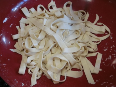 5-4がいる「玉の家」では、延ばして畳んだほうとうを切り始めました。