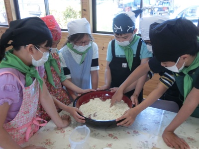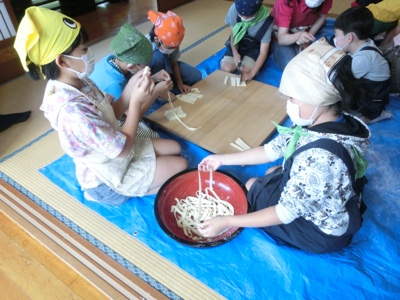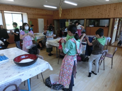 次はほうとう作りです。クラスごとに4つの民宿に分かれて体験します。5-2は「出口荘」という民宿にお世話になります。