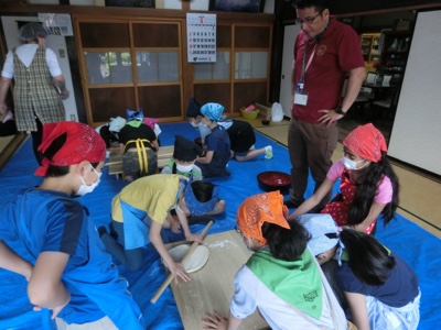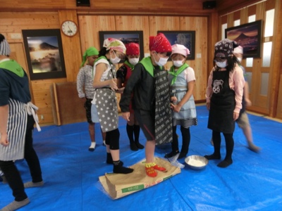 民宿によって作りかたが少し違います。ここでは小麦粉の玉をビニールと紙で挟んで足で踏む作り方です。