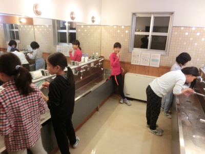 夜のイベントが終わり、部屋に戻って就寝準備です。まず、検温をしてカードに記入します。キャンプファイヤーの興奮でちょっと体温が上がっている子もいましたが一時的なもののようです。