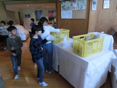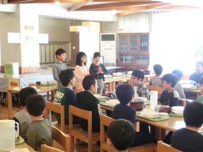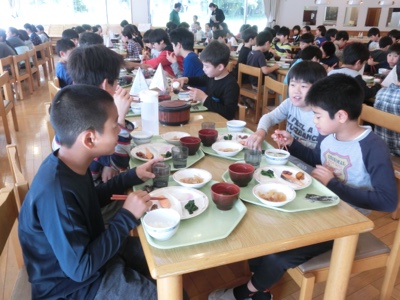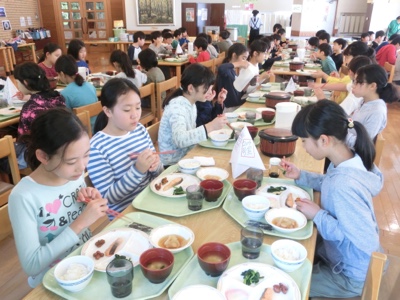 2019-06-18 5年富士学園移動教室2日目②朝食 朝会のあと、食事係が朝食の準備を始めました。 今日のメニューは、焼き鮭、ごはん、お味噌汁などです。 いただきますの挨拶をします。 元気に食べ始めました。 ごはんとお味噌汁はお代わりができるのですが、厨房の大鍋が空になるまで食べました。 部屋に戻るときに、お茶を入れてもらった水筒を受け取ります。 お弁当ももらいます。リュックに詰めて、登山の準備をします。 Home › 5年 › 5年富士学園移動教室2日目②朝食 関連記事 連合音楽会の発表 引き継いだ太鼓を練習する5年生 今日の学校風景 今日の授業風景 今日の授業風景 5年富士学園移動教室2日目①起床 5年富士学園移動教室2日目③高座山登山