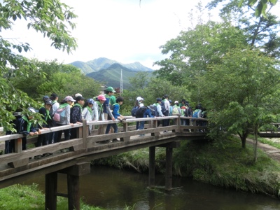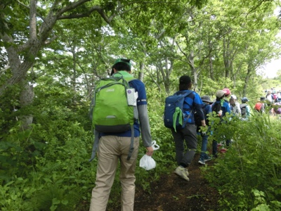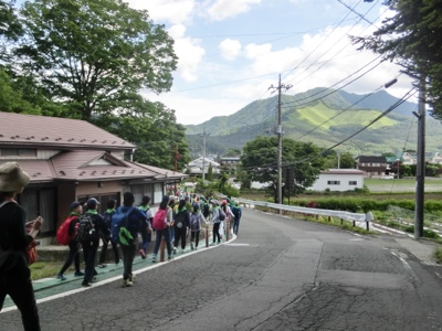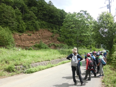 忍野八海から山の方に歩いていきます。途中で地層の見える露頭を見学しました。6年生になったら理科で学習します。