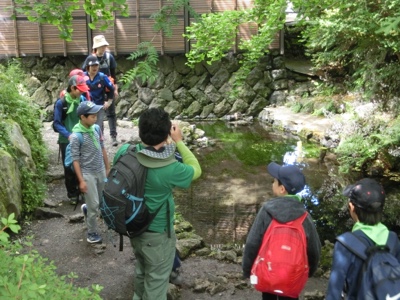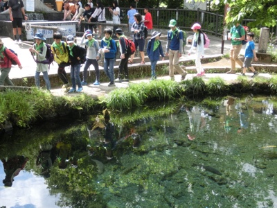 これは忍野八海の一つ、湧池です。深くまで見える透明な水を見て歓声を上げていました。