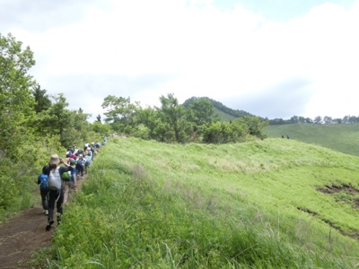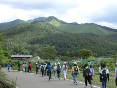 高座山に向かって歩いていきます。「正面の三角のところまで登るんだよ」というと「え〜っ」「もう疲れた」という声が…。また山登りは始まってません。