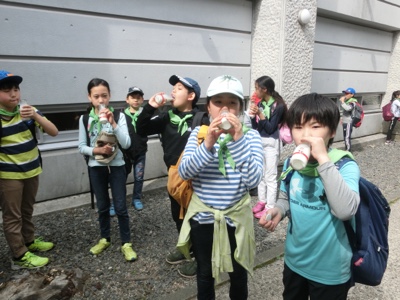 玄関前で冷たい牛乳を飲みました。喉が渇いているのでとても美味しかったです。ハイキングが無事に終わりました。怪我なく帰ってこられて良かったです。