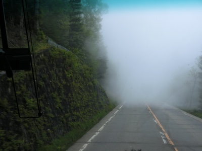 バスはスバルラインを登って富士山5合目に向かいます。下から見上げる富士山は雲で覆...