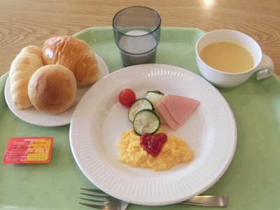 今朝のメニューは、パン、スクランブルエッグ、コーンスープなどです。パンが3つあるので、食べられそうもない人は予めトングで籠に戻してお代わり用にする、という説明でした。