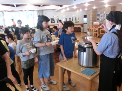 今朝もスープのお代わりに行列ができていました。早々にお鍋が空になりました。