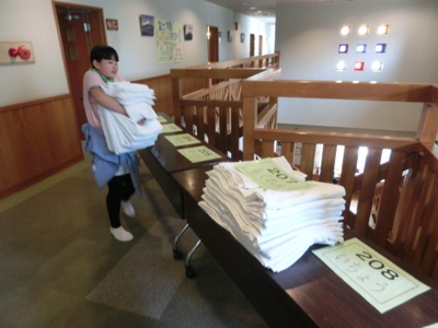 シーツ、掛け布団カバー、枕カバーを外して畳んだら、部屋担当の先生に畳み方と枚数をチェックしてもらって部屋ごとに返却します。
