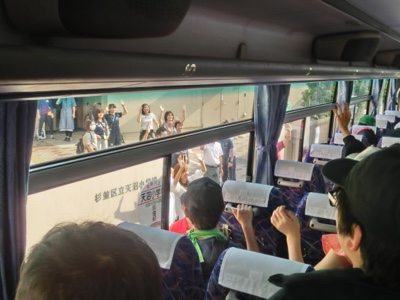 天沼小に到着しました。お出迎えの先生たちが手を振ってくれています。