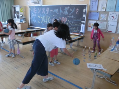 1-1は「モンスターペトボンをこうりゃくせよ!!」。ペットボトルボウリングですね。