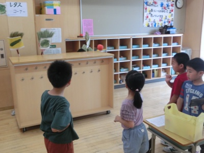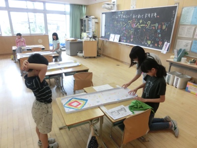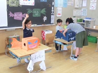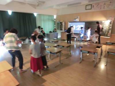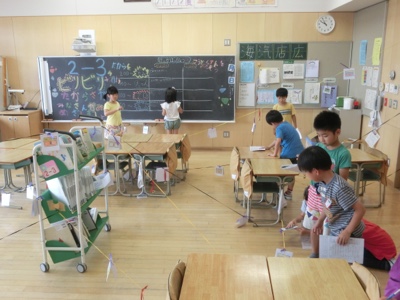 今日は「天沼まつり」。各クラスがゲーム等のお店を出して、お客さんを楽しませるイベントです。放送で開会式をしてスタート!