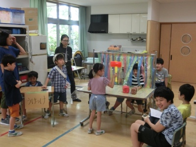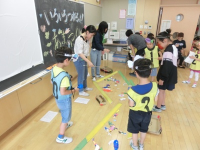 こだま学級は「どんどこ もぐらたたき」。カーテンの向こうから出てくるペットボトルのモグラをハンマーで叩くゲームです。