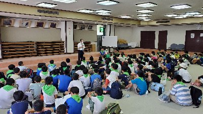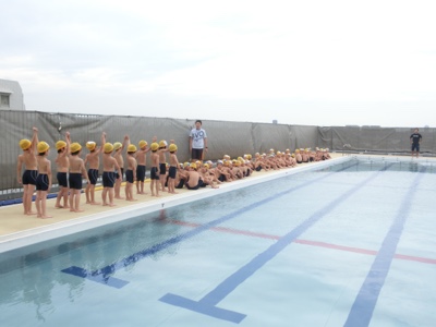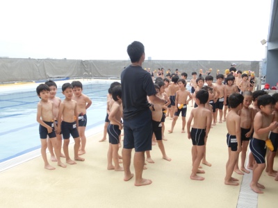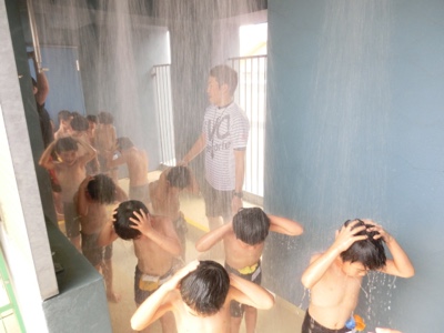 準備体操のあと、シャワーを浴びる練習です。待っている間、子どもたちは「じ・ご・く! じ・ご・く!」と地獄コールをしていました。