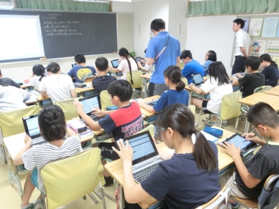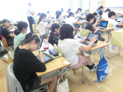 6-3の教室では、タブレットを使って解き方を考えていました。