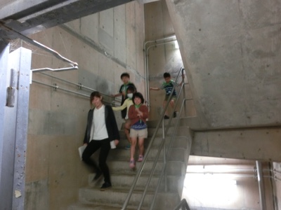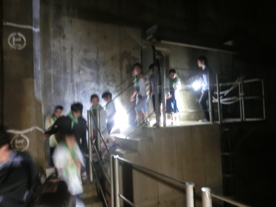 続いて、階段を降りて地下43mにある貯水池を見学に行きます。階段は222段。14階建のマンションと同じ高さ(深さ)があるそうです。