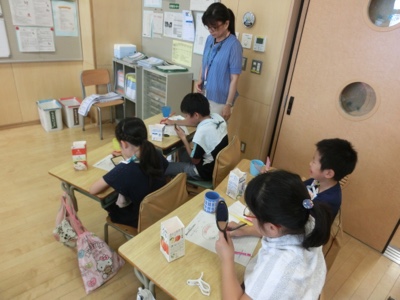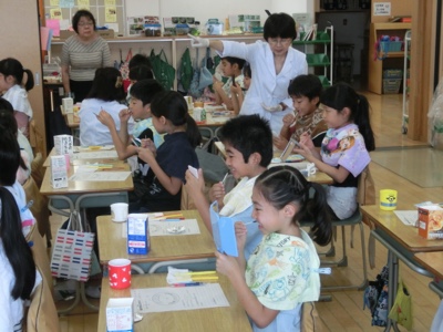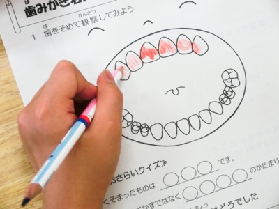 ワークシートに、自分の歯を観察した結果を赤鉛筆で塗りました。普段の歯磨きで歯垢が取りきれていない場所がどこなのかはっきりします。