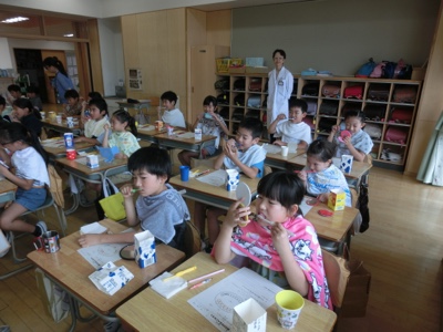 3年生の3クラスとこだま学級で、口腔保健指導がありました。歯科衛生士さんから、正しい歯磨きのしかたの指導を受けます。まずは、歯に良くないことについて教えてもらいました。これは3-2の様子です。