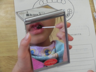 綿棒に付けた歯垢染色液を鏡を見ながら塗っていきます。