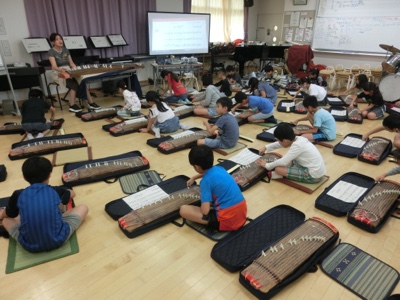 音楽室で4年生が箏を演奏していました。音楽の授業の中で、和楽器を扱う時間があるのです。音楽専科の長谷川先生が指導をしています。これは4-3の様子です。