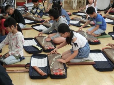 子ども用の短い箏ですが、一人一面ずつ使うことができます。この箏はNPOのスクールアドバイスネットワークからお借りしています。正座が難しい子どももいるようですが、姿勢よく弾こうとしていました。