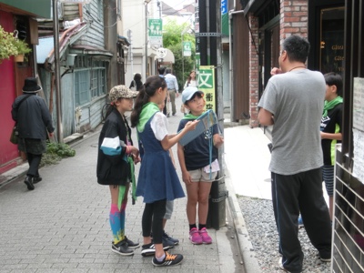 駅前通り商店街です。呼び止めても止まってくれない人が多い中、足を止めて丁寧に答えてくれると、子どもたちも嬉しそうでした。
