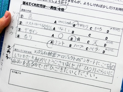 色やデザイン、香り、いくらだったら買ってもらえるかなど、意見を集めていきます。
