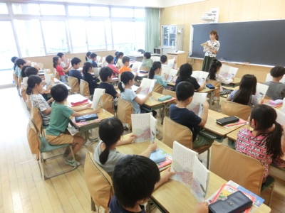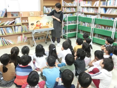 1-3の子どもたちは図書室で司書の古賀先生に絵本の読み聞かせをしてもらっていました。「おこだでませんように」というタイトルの絵本です。最後まで集中して聞いていてすごいなと思いました。