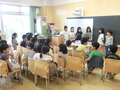 3-3は係活動ごとに出し物をしていました。「新聞会社」の子どもたちが、1学期の出来事をクイズにして出題しているところです。