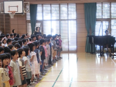 終業式は「儀式的行事」なので、校歌斉唱をします。音楽の長谷川先生の伴奏で元気よく歌いました。
